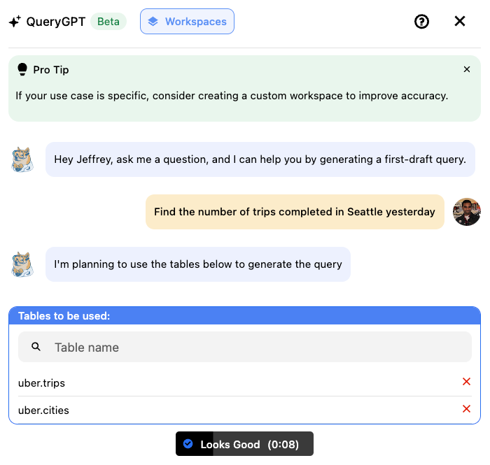 QueryGPT automatically generates the correct SQL query to fetch the answer in seconds.