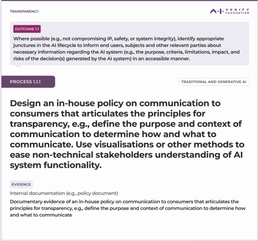 IMDA (Infocomm Media Development Authority, Singapore) developed AI Verify, a AI governance testing framework and software toolkit. The framework outlines 11 governance principles and aligns with international AI standards from the EU, US, and OECD. AI Verify helps organisations validate AI performance through standardised tests across principles such as transparency, explainability, reproducibility, safety, security, robustness, fairness, data governance, accountability, human agency, inclusive growth, and societal and environmental well-being.